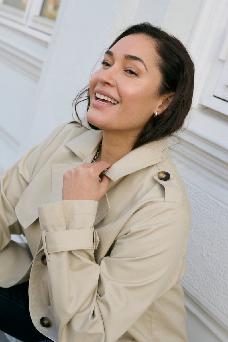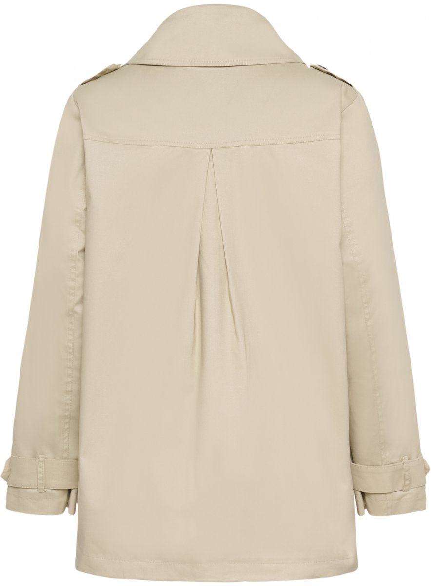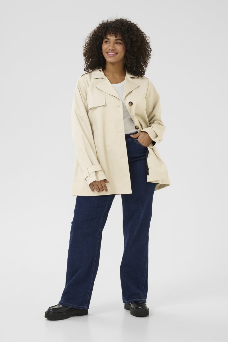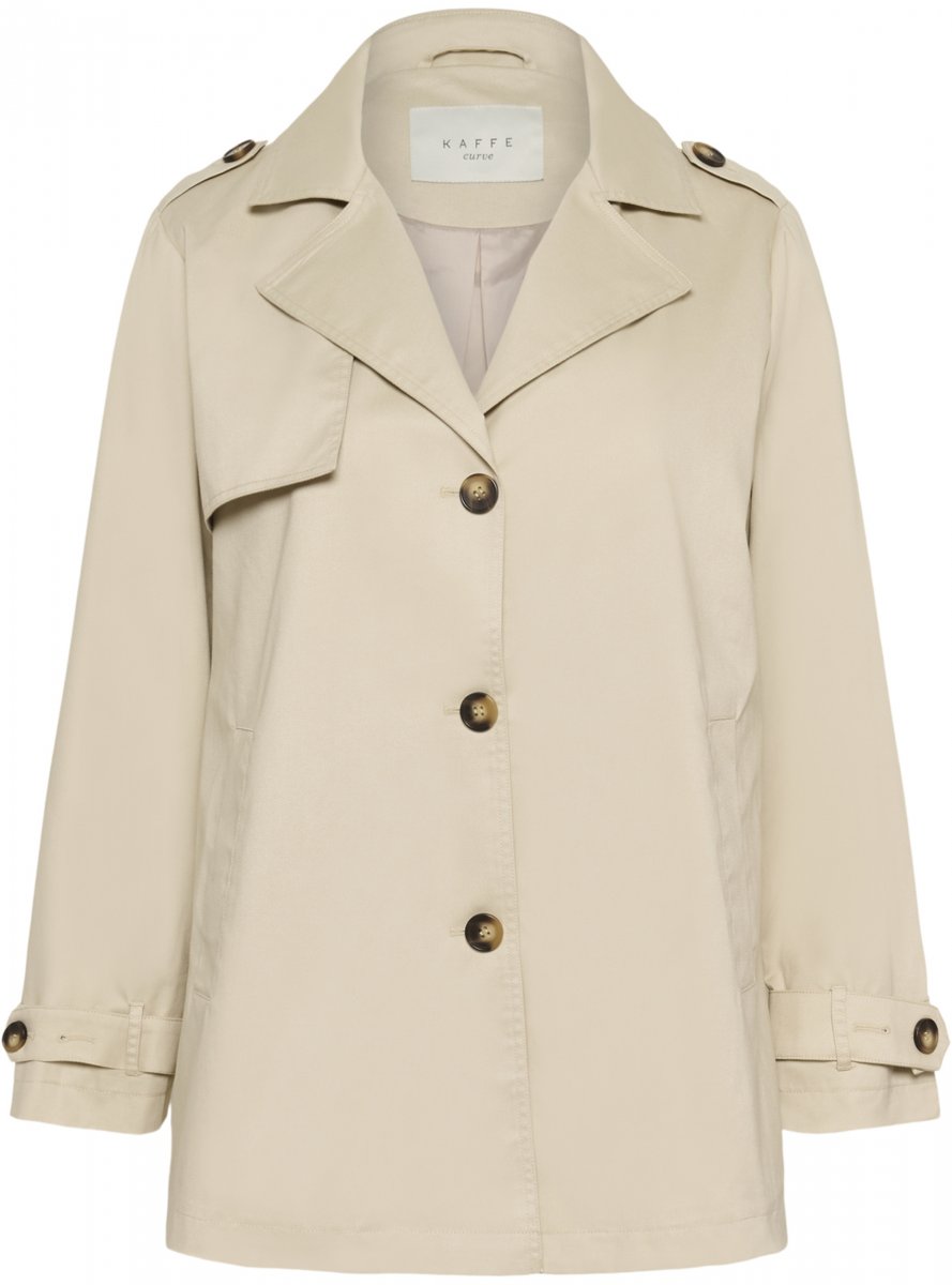 Lühike mantelSaadaval suurustes 42–54Brändilt Kaffe CurveValmistatud 65 % polüestrist ja 35 % puuvillastAvar lõigeToote värvus on beež