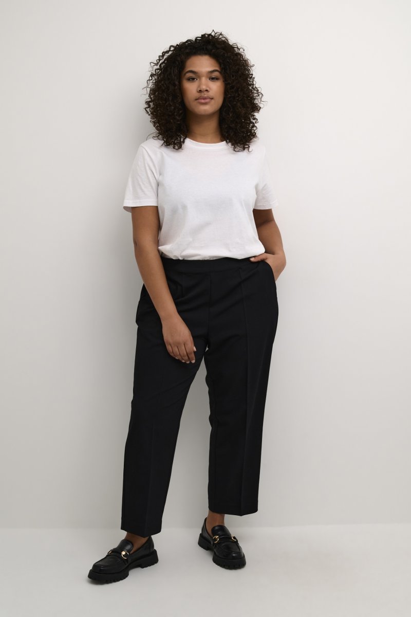 PüksidSaadaval suurustes 42–56Brändilt Kaffe CurveValmistatud 77% polüestrist (taaskasutatud), 18% viskoosist, 5% elastaanistTavalise lõikegaToode on mustNäita suuruse juhendit