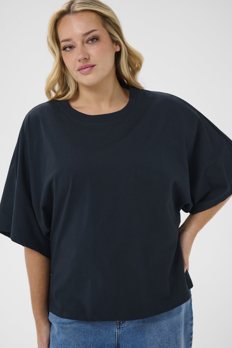 T-särkSaadaval suurustes S–XLBrändilt Kaffe CurveToode on kvaliteetne 100% puuvillAvar lõigeVärv on tumesinineNäita suuruse juhendit