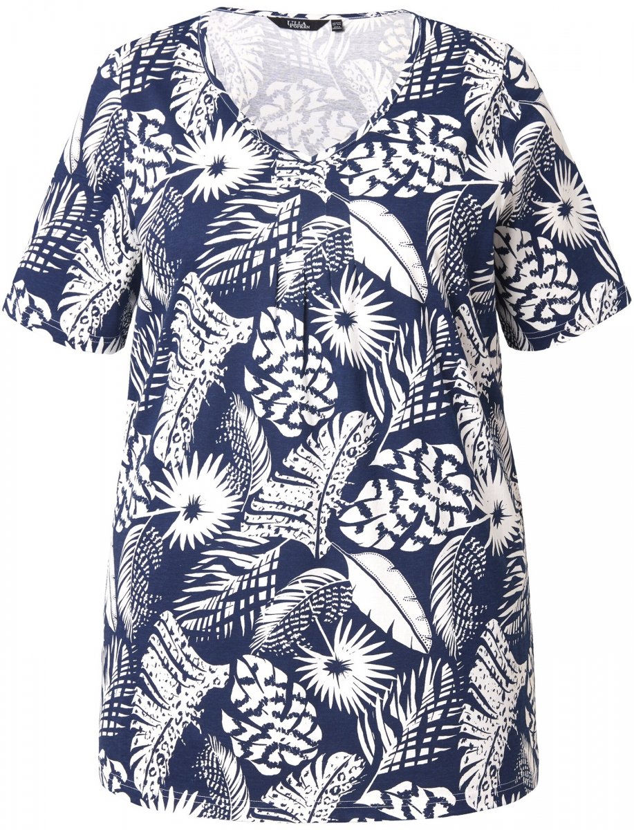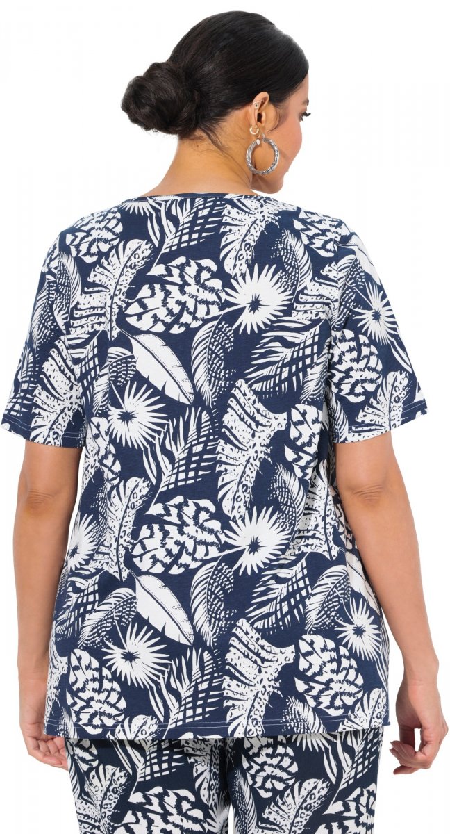 Ulla Popken Feather Print Short Sleeve V-Neck Tee Ink Blue