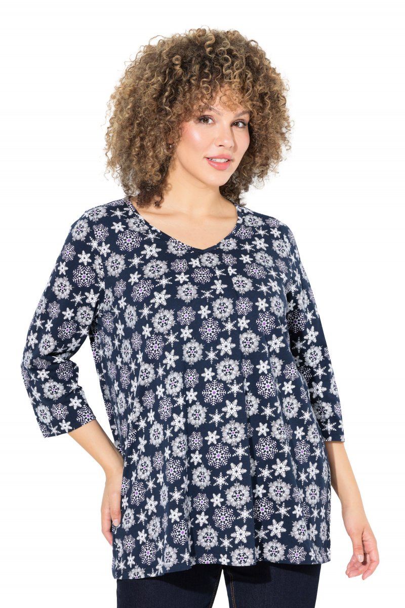 Ulla Popken Snowflake Print 3/4 Sleeve A-Line Tee Navy