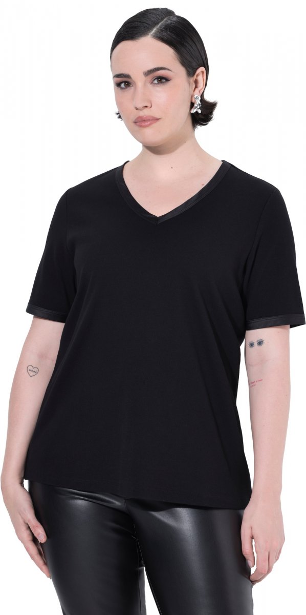 Ulla Popken Satin Trimmed Ribbed Jersey Short Sleeve T-Shirt Black